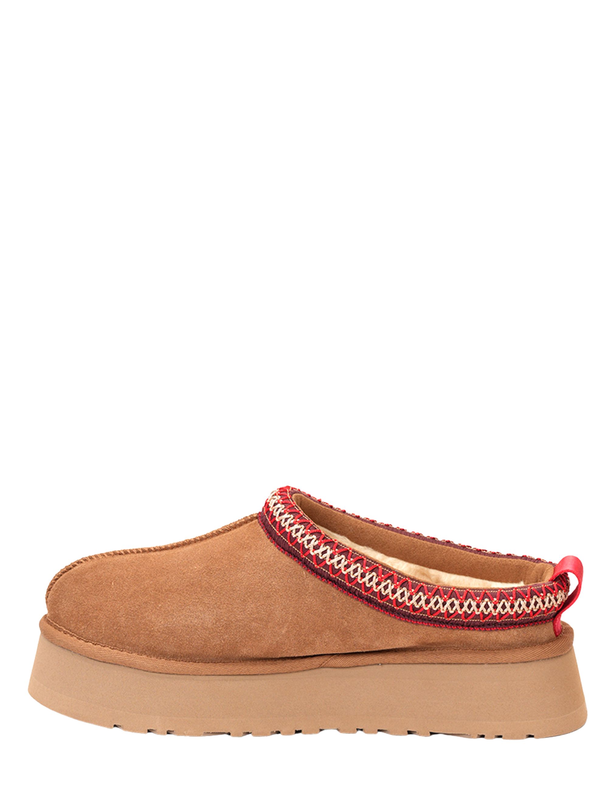 Pantofola Tazz II di UGG marrone in pelle scamosciata, caratterizzata da platform, fodera in UGGplush, suola in EVA, rifiniture intrecciate e logo UGG stampato a caldo in rilievo.
