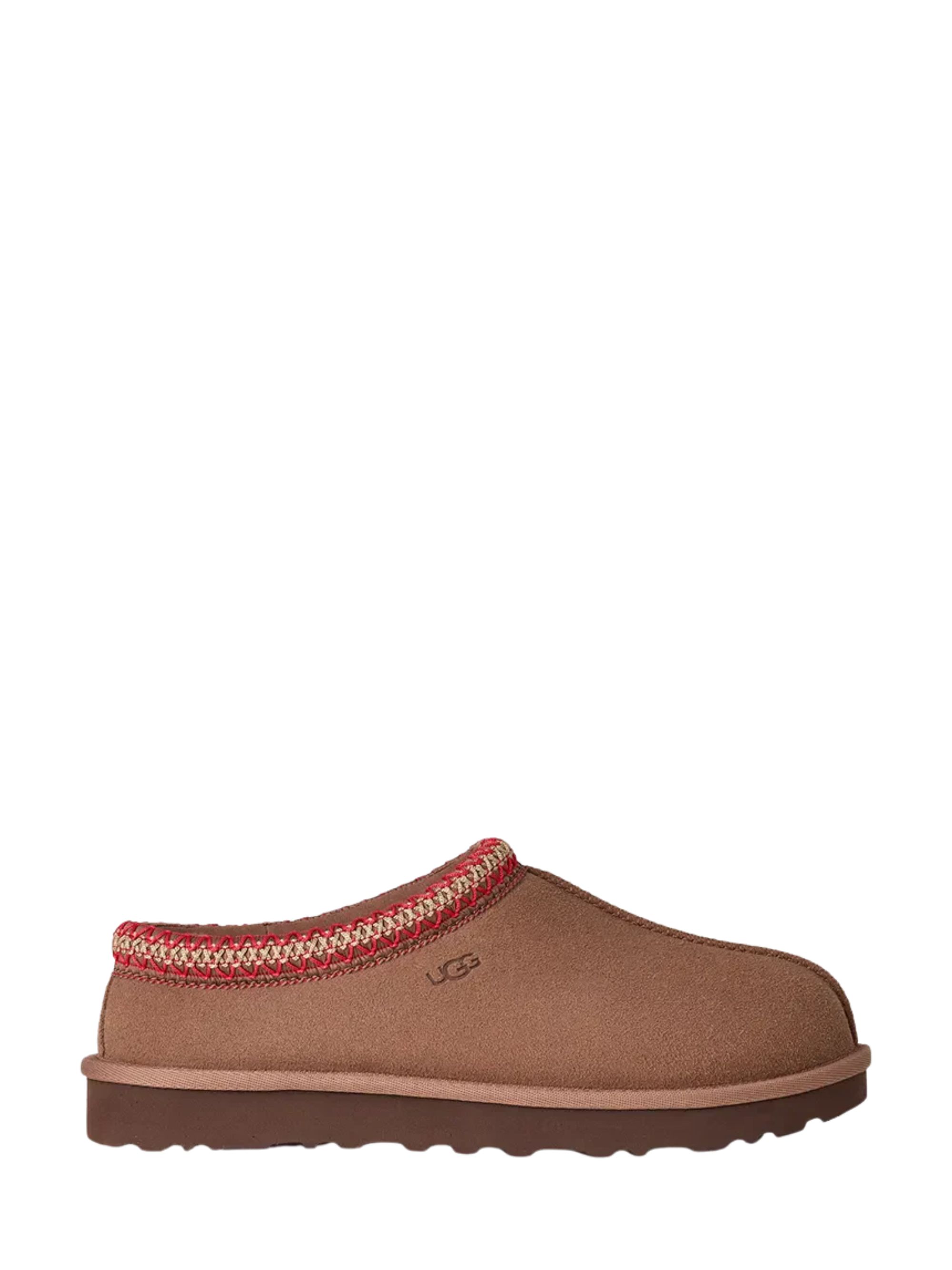 Pantofole Tasman II di UGG marrone in pelle scamosciata, caratterizzate da soletta interna imbottita, suola in gomma e rifinitura intrecciata.