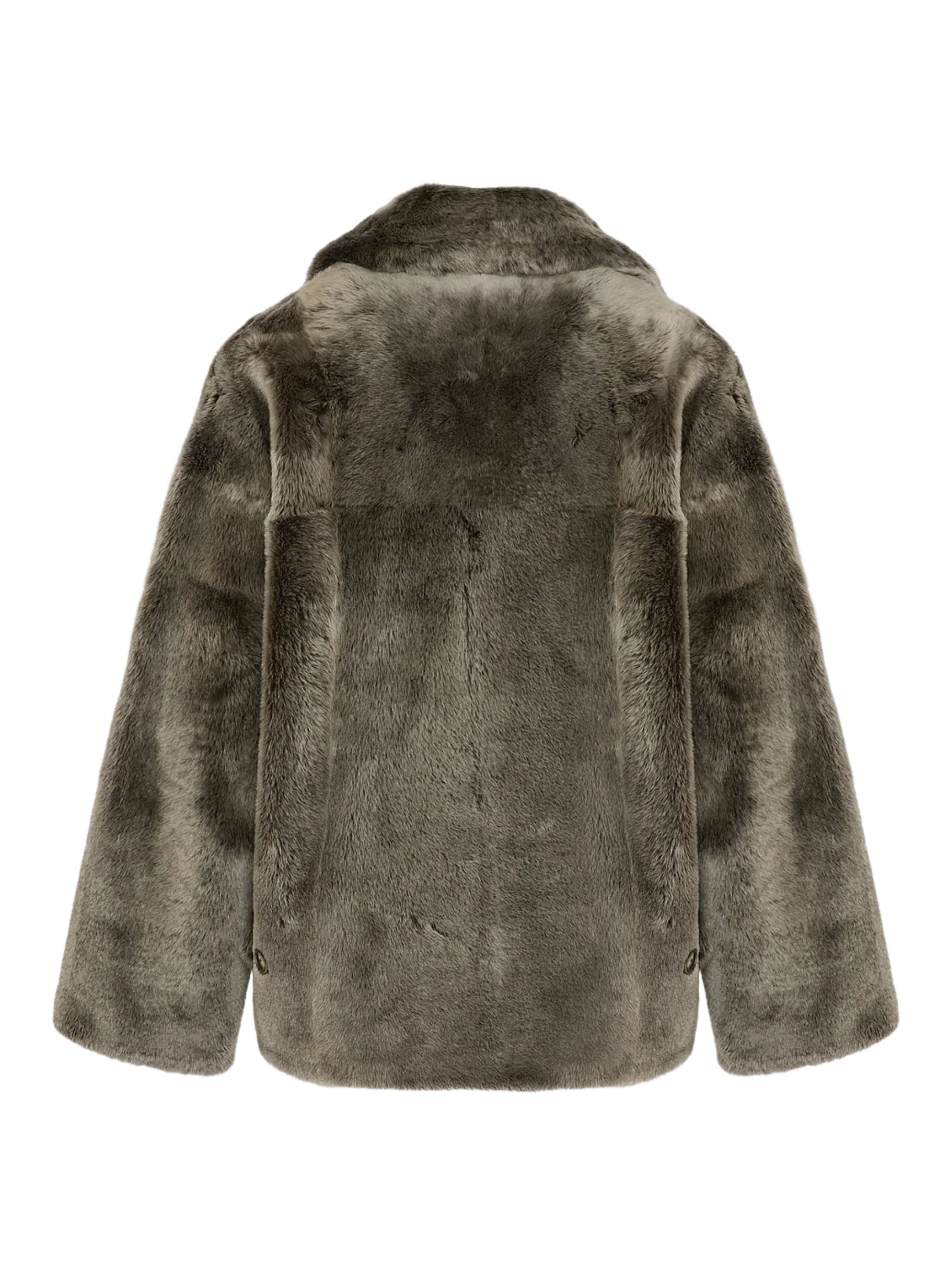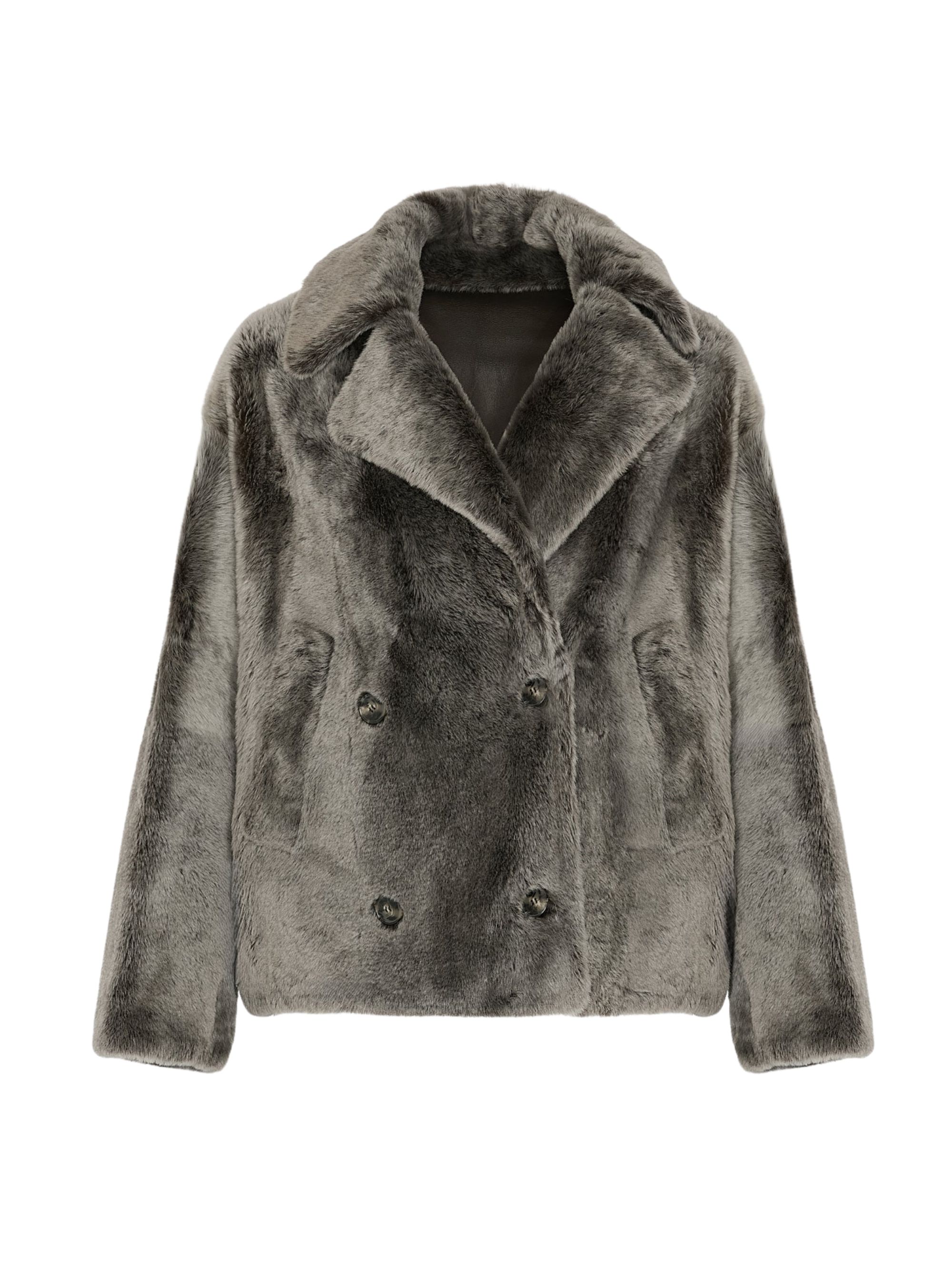 Giacca di piselli da shearling di YVES SALOMON grigia in pelle di agnello, caratterizzata da colletto dentellato, linguette di serraggio decorative, tasche a filetto e chiusura con bottoni.
